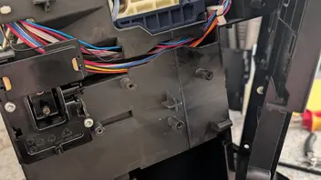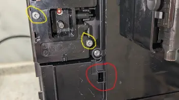 Danach die vier Schrauben an den Seiten oben lösen und den Deckel so gut wie möglich zur Seite legen. Jetzt alle Schrauben bis auf die oben gelb markierten lösen. Rastnasen der Frontabdeckung lösen und selbige zur Seite drehen