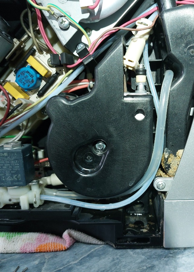 Ich habe Wasserlauf verfolgt und Schläuche vor und nach jedem Bauteil mit der Wasserflussrichtung abgeklemmt und die Maschine jedes mal erneut gestartet. Wasser kam nach der Wasserpumpe. Danach kam (sehe Foto) schwarzes Teil und rein ist Wasser gekommen, raus aber nicht mehr.