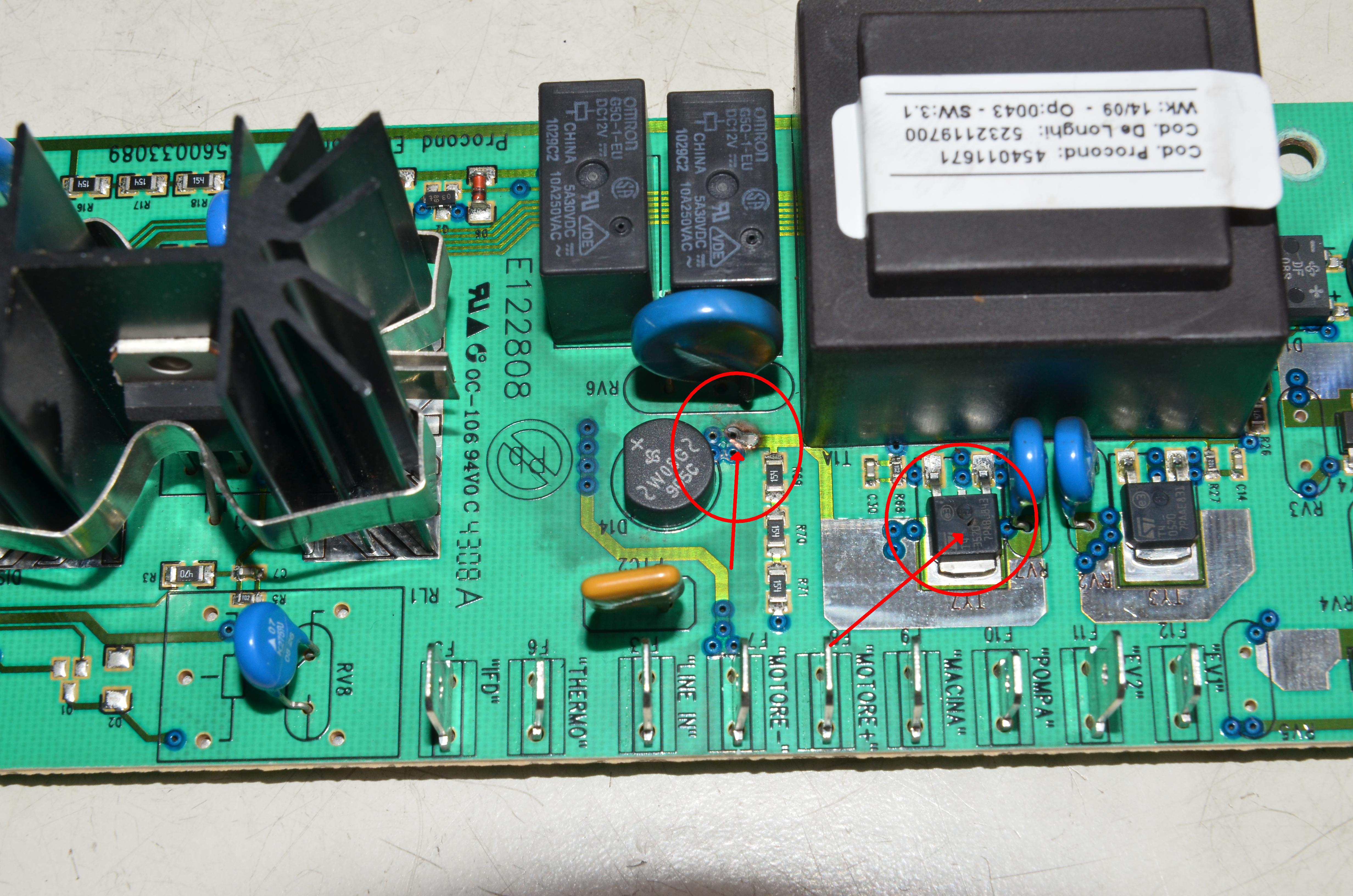 Auf dem Bild siehst Du im Bereich vom D14 eine defekte Durchkontierung und Leiterbahnauflösung. Der Triac TY7 hat eine Abplatzung und ist ebenfalls defekt. Grund war auch hier eine schwergängige Brühgruppe. Die Maschine zeigte die selben Symptome wie Deine.