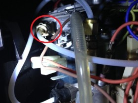 Mein Problem mit unserer Kaffeemaschine ist, das sie undicht ist. Habe eben die Rückseite von der Maschine abgebaut und gesehen wo das Wasser "spritzt". (Bild eingekreist).