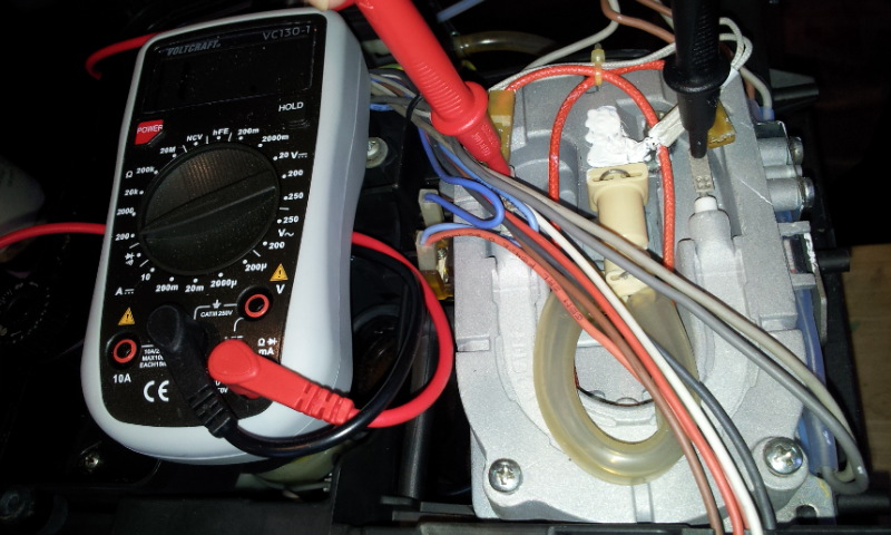 Nach Entleeren des Kaffeesatzauffängers zeigt die Maschine plötzlich das rote Ausrufezeichen und verweigerte ihren Dienst. Die Warmhalteplatte wurde nicht mehr warm und Kaffee gabs natürlich auch nicht mehr. Die Maschine wurde mehrmals ein und ausgesteckt der Auffangbehälter auch mehrmals wieder in die Ausgansposition zurückgeschoben. Ich vermute jetzt, daß der Thermoblock nicht mehr will, komm aber mit den Messungen nicht hin. Eigentlich sollten ja 40 Ohm gemessen werden, bei def. TB irgendwas über 80 Ohm - ich kann hier aber gar nichts messen. Bedeutet das nun klar, dass der TB kaputt ist oder sollte ich noch weiter nach Fehlern suchen?