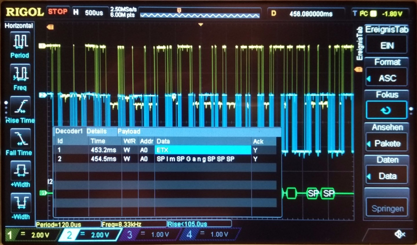 Mit einem I2C-Sniffer ist Datenverkehr auf die Adresse 0x78 zu erkennen --> sollte mit einem 7036i Display funktionieren