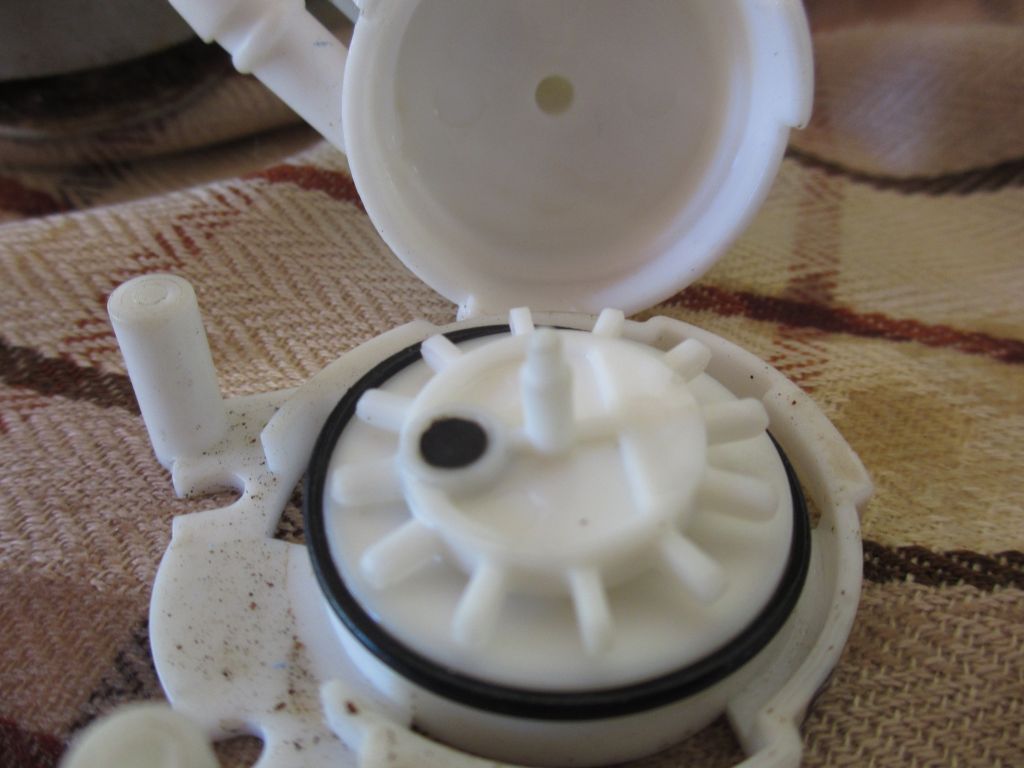 So, Maschine ist offen und die Rückwand liegt vor mir; in Kürze wegen des Kundenbetriebes zunächst eine kurze Beschreibung: die Maschine hat innen immerhin 4 Reparaturzettel. Wer das Flowmeter samt Schläuchen einfach reingelegt hat, ist wohl unwichtig; ich habe es gefunden, geöffnet und festgestellt, daß es innen sauber ist und der "Kreisel" innen wirklich leichtgängig ist- ebenso die beiden Schläuche sehen aus wie neu. Also scheint die Pumpe was abzuhaben, oder..?
