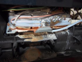 Ich habe also die Rückwand der ESAM abgeschraubt um vielleicht schlauer zu werden. Siehe da, weitere Kalk- und Korrosionsspuren von austretendem Wasser.