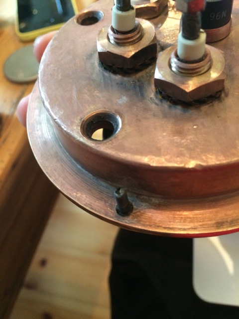 - Der Kesselflansch hat ja diese 3 Madenschrauben, da wurde wohl mal was "repariert" - in einem der Löcher steckt ein Gewinde, dünner als die Madenschrauben, das scheint aber ein so dünnes Profil zu haben dass ich mir nicht vorstellen kann dass man da eine Mutter draufbekommt, jedenfalls war keine drauf sondern an der Stelle war der Kessel am Fuß nicht verschraubt.