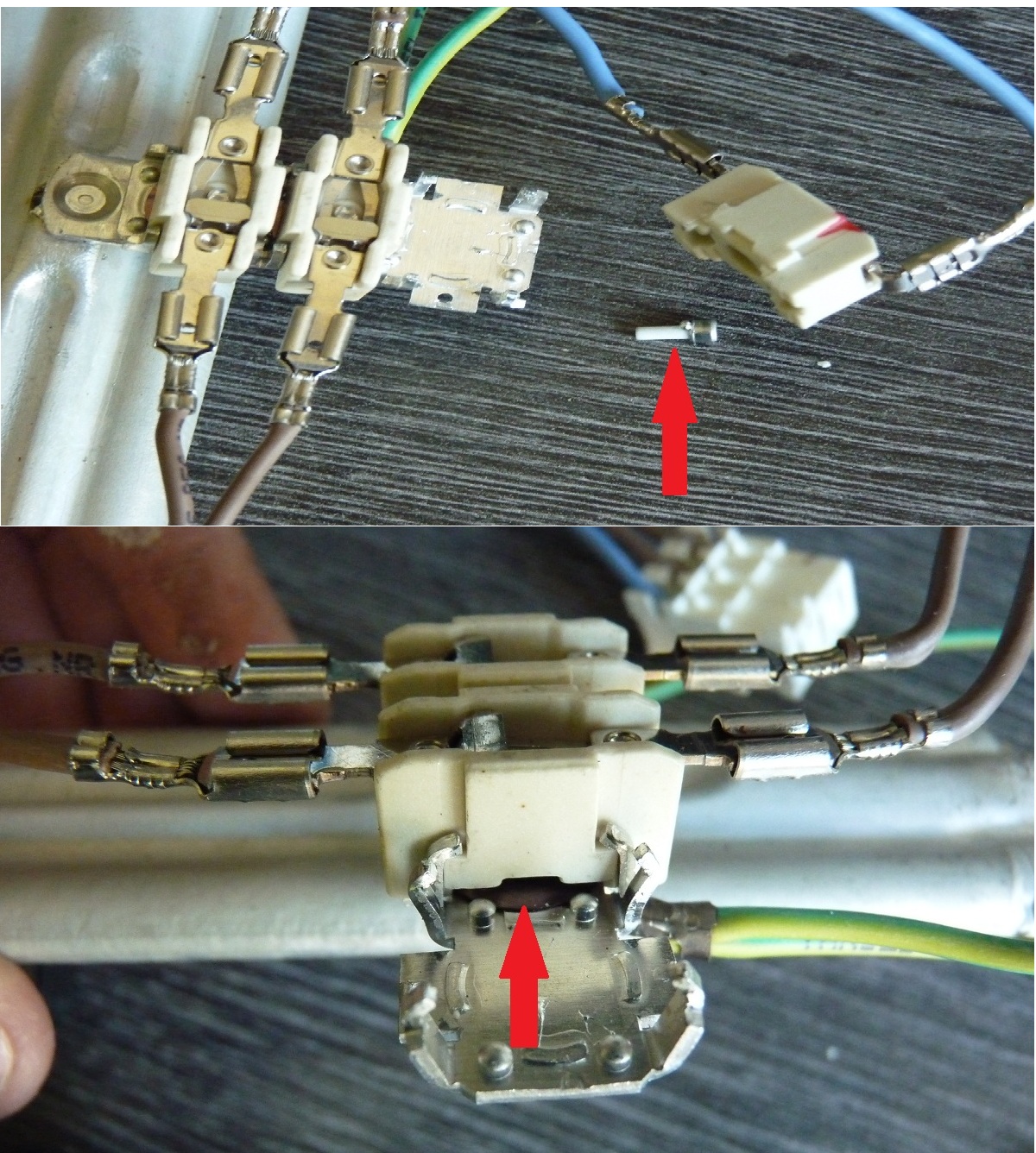 So habe den Durchlauferhitzer abgebaut und bemerkt, dass beim rechte Schalter eine kleine Sicherung rausgefallen ist die ich auf dem Foto mit einem Pfeil markiert habe.