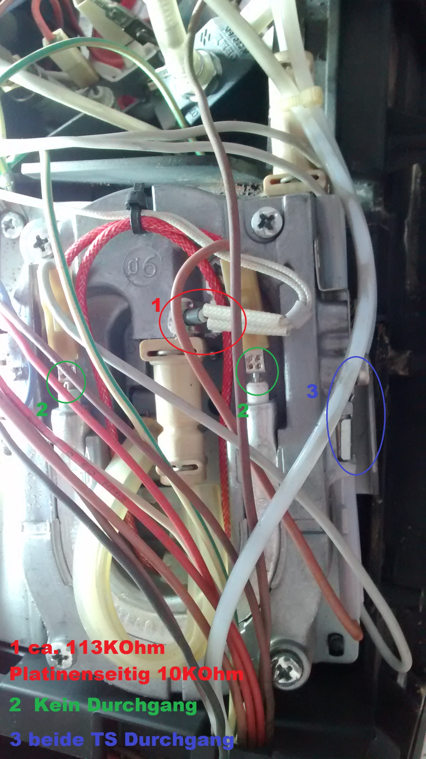 Jetzt habe ich sie geöffnet und zuerst einmal versucht den Temparaturfühler zu Messen. Dabei viel schon auf das Heizelement(ich glaube Dampfheizung) wird heiss und der Widerstand des Temperaurfühler nimmt ab. Meine Werte liegen bei kalt ca. 110KOhm, der Wert bei Erwärmung bei ca.5KOhm.