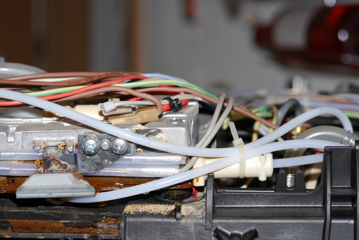 Leider hat meine Promadonna nun ein Problem mit der Dichtigkeit im Bereich des Thermoblocks. Das Wasser sprudelt bei Kaffeebezug an der markierten Stelle zwischen TB und dem weißen Plastikteil.