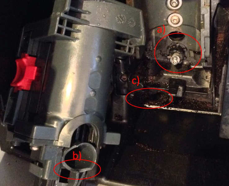 Die untereren Pins an der Brühgruppe (b) und in der Magnifica (a) sind abgebrochen. Die Brüheinheit fährt zwar wieder und findet sowohl den oberen als auch unteren Anschlag, allerdings ist der Trester sehr nass, zerfällt und ist so flüssig, dass er in den Innenraum fließt (c).