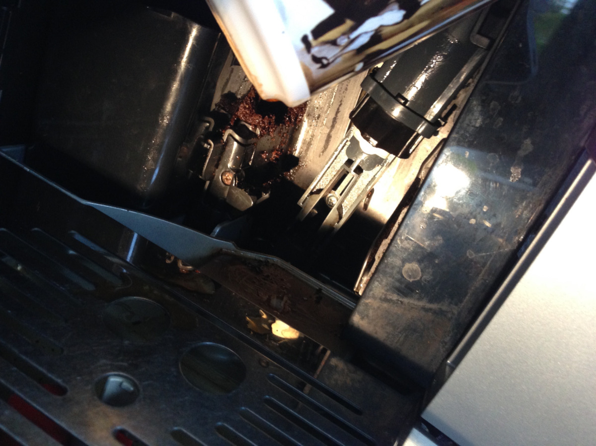 Habe ich die Maschine nun endgültig geschrottet und besteht noch Hoffnung? Den unteren Anschlag findet die Maschine anscheinend, indem der Brühschlitten auf die Schulter des Pins fährt (der steht ja noch). Meine Hoffnung ist, dass der nasse Trester doch noch irgendwo anders herkommt.