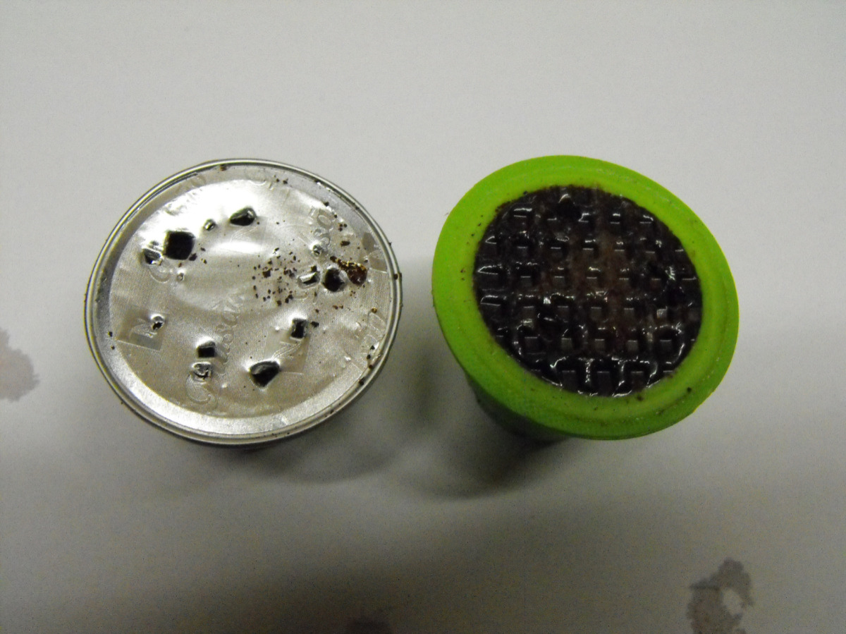 Bild 1 links im Anhang zeigt eine Markenkapsel mit Alu Membrane die bereits mehrfach durchstochen wurde, die Pyramidenplatte kann hier nicht mehr greifen da die Alumembrane bereits gedehnt,Der Kaffeedurchlauf lief gut zufriedenstellend.
