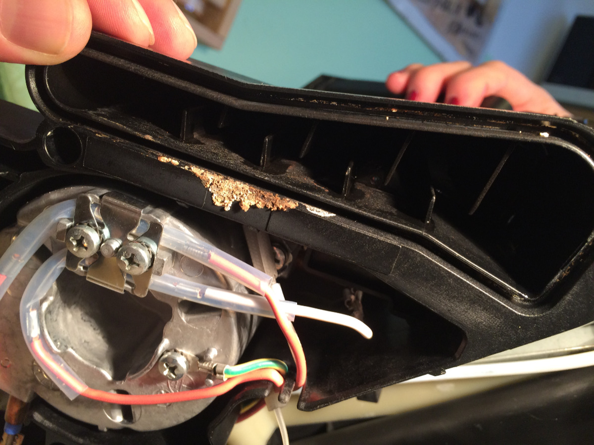 Jetzt hat sich ein neues Problem aufgetan: Gestern wollte ich mir einen leckeren Kaffee machen und habe gesehen, dass unter der Maschine eine Wasserpfütze ist. Ich dachte schon, dass ich beim Einbau der Kupplung etwas übersehen habe. Ich habe die Maschine ausgeschraubt und erstmal nur gesehen, dass das Wasser von Oben aus Richtung der Kupplung kommt. Bei der Kupplung war aber alles in Ordnung.Unten beim Wasserauslauf kam das Wasser nicht nur aus der Öffnung des schwarzen Kastens, sondern irgendwo darüber her. Also habe ich diesen großen Kasten unter der Kupplung abgeschraubt (siehe Bilder). Die "Dichtstellen" sind sehr verkalkt. Ich vermute, dass das Wasser dort austritt. Zwischen den beiden Hälften ist auch keine Gummidichtung angebracht. Oberhalb des Kastens scheint alles trocken zu sein.