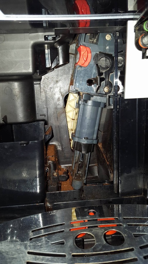 Kaffee landet nicht auf die Brühgruppe, weil die Brühgruppe sich an der falschen Stelle befindet. (siehe Bilder)