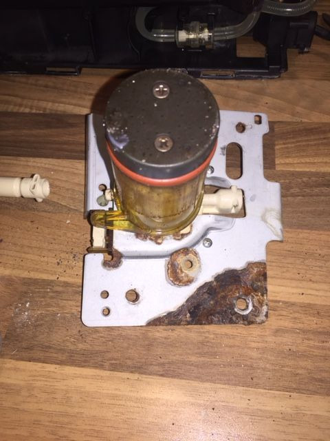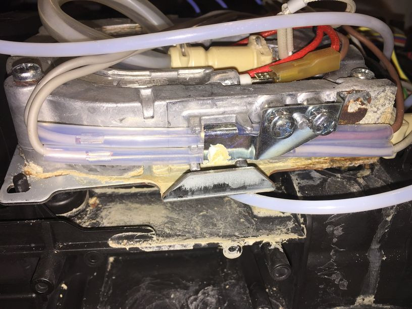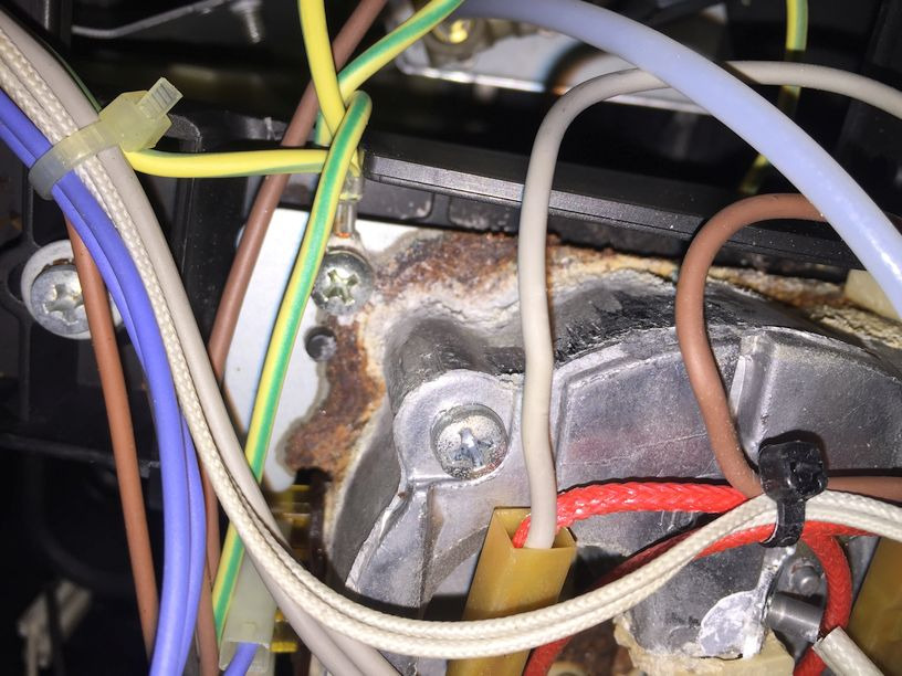 Heute habe ich die 5400 nun mal auseinandergenommen, um herauszufinden, woher das Wasser kommt. Schuld ist der Thermoblock, aus dem schon beim Spülvorgang nach dem Einschalten ordentlich Wasser läuft. Man sieht es dem ganzen Bereich um den Thermoblock auch an: die Trägerplatte ist extrem angerostet, es liegt ein übler Kalkbelag auf dem Thermoblock und den umliegenden Kunststoffteilen. Ich habe mal ein paar Bilder von dem Bereich gemacht:
