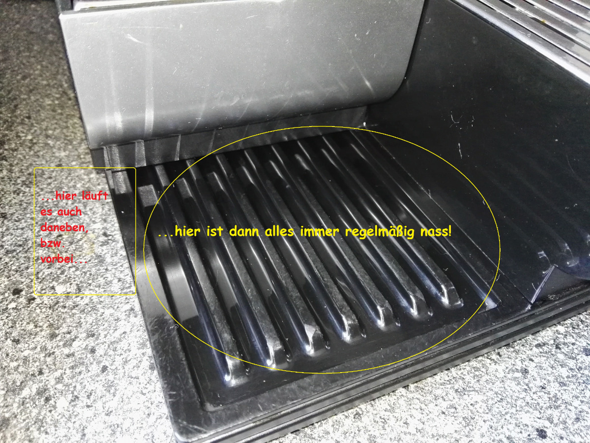 Zum anderen beobachte ich seit gut 2 Wochen einen regelmäßig entstehenden See im Bercih der Abstellfläche für die Kaffeetasse UND auch