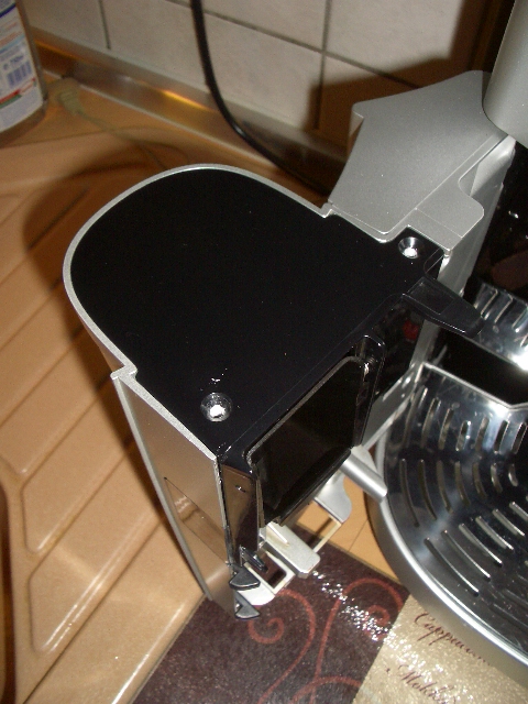 • Klar kann man den Auslauf komplett zerlegen, zu mindest ging das bei der 6600 sehr einfach, ich nehme an, dass die Konstruktion bei allen Maschinen die Gleiche ist. Oben an der Innenseite der Tür, direkt über dem Auslauf die Schrauben lösen, schon kann man alles zerlegen. Der äußere Teil wird dann nach unten durchgeschoben und auch die Wippe kann man leicht zerlegen.