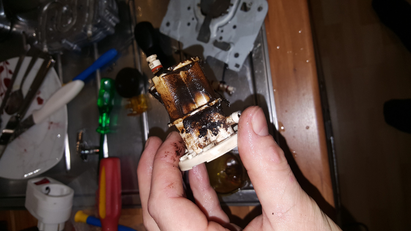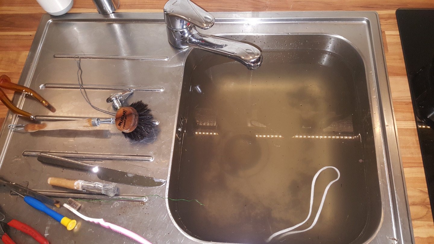 Das Wasser auf dem Bild ist nur der Dreck aus dem Brühkolben,,,sämliche Abläufe ins Unendliche verstopft, Kolben Schwarz,Teile alte Teile der Gummidichtungen im Sieb (obwohl keine Gefehlt hat??), Gummischläuche vom Tank zur Pumpe von innen dunkel bis stellenweise schwarz (Schimmel?)