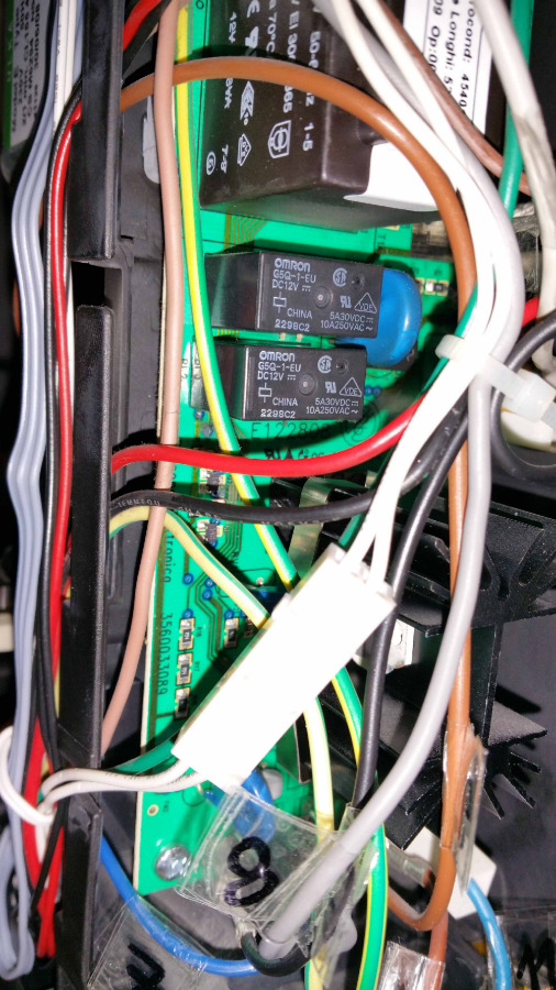 Maschine hat nen Vogel. Wenn ich richtig liege schalten bei meiner Maschine zwei Relais unter dem großen schwarzen Block mit der Delonghi Nummer das Auf- und Abfahren der BG - ist das richtig (siehe Foto)?