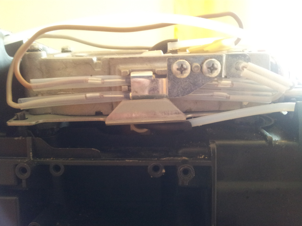 Da alle Wege frei waren, die Pumpe und der obere Brühkolben neu waren,kam mir der Gedanke, dass das Wasser evtl. einfach nicht über die Brühgruppe abfließen kann wie es soll. Resultat ist, dass das Wasser dann über den schwarzen Schlauch abgeht.