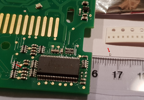 Noch einfacher wäre es sogar den Kondensator auszutauschen. Ich hatte leider nur keinen 0204 (oder was auch immer das genau ist) in der benötigten Kapazität da. Mit SMD Tweezers wäre das eine Sache von 5 Minuten (einschließlich Flußmittel entfernen nachher).