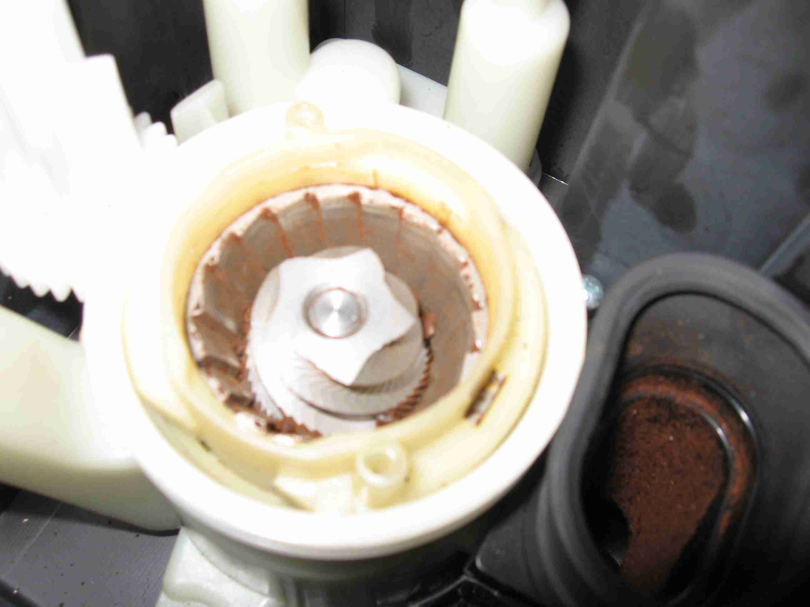 Und zwar habe ich heute die EAM 3200 S auseinandergebaut um nach dem Mahlwerk zu sehen bzw. genauer gesagt um zu sehen ob der innere Kegel 2 oder 3 Löcher hat, damit ich weiß welche Version ich bestellen muss. Mein Problem ist jetzt das ich den inneren Kegel nicht von der Achse abbekomme. In den Anleitungen steht das der Kegel von oben mit einer Mutter oder Schraube gesichert ist (so kenne ich das auch von Jura). Aber hier habe ich weder Schraube noch Mutter. Sondern die Achse hört plan mit dem Kegel auf. Jetzt habe ich das ganze schon von unten Zahnrad und so weiter abgeschraubt und habe nur noch den inneren Kegel fest auf der Achse. Also meine Frage: Wie bekommt man den Kegel von der Achse!?