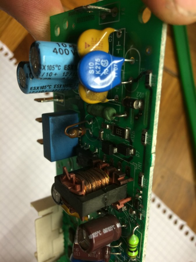 Komponent "U5" hat Aufdruck "79M05", richtig? Das ist ein sehr wichtige Komponent --> macht eine Spannung von -5V aus -12V, Diese Spannungen bracuht die Platine um zu funktionieren.