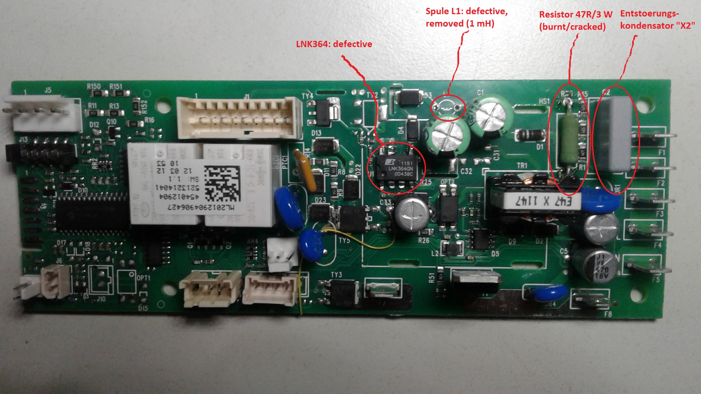 - LNK364GN: Widerstand zwischen "S" und "D" ist nur noch 19 Ohm... ist bei einen neuen 15 MOhm (!) --> also auch defekt / kurzgeschlossen