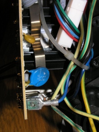 Die blaue "Scheibe" ist ein Varistor, ein Überspannungsschutz, dieser liegt parallel zu den Anschlüssen des Trafos !