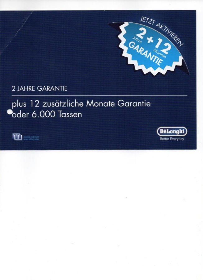 Der Verkäufer sicherte uns eine Garantieverlängerung von 12 Monaten oder 6000 Tassen zu, hierzu gab er uns einen Flyer von De´Longhi. Diesen füllten wir aus und sendeten ihn an die Fa. De.....