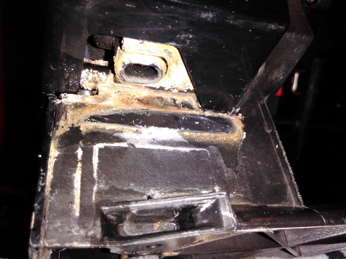 wenn man von links reinschaut, sieht man das der "Auslaufschnüdel" welcher in das rote Auffangschälchen geht (das Teil wo versifft ist) links am Chassi-Geäuse anliegt. Ich bin der Meinung dass es da zu einer Art Kapilarwirkung kommt. Wenn es dann noch verschmutzt ist läuft da erst recht Wasser nebendrann vorbei.