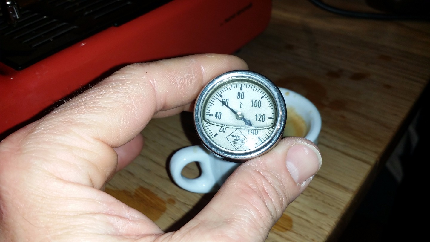 Eine Temperaturmessung des Wassers, nach unmittelbaren Bezug aus der Brühgruppe, ergab 69 Grad. Beim Durchlauf, durch den mit Espresso befüllten Siebträger, hatte der Kaffee dann eine Temperatur von 56 Grad. (Wurde zwar mit dem Ölmessstab mit integriertem Thermometer vom Moped gemessen, aber Not macht bekanntlich erfinderisch :1f607: )