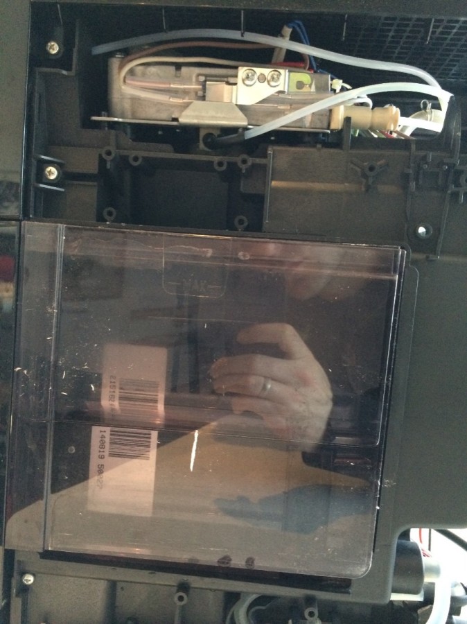 Maschine heizt auf, aber beim Spühlen schießt nun das heiße Wasser aus der Öffnung seitlich über dem Wassertank (Abdeckung seitlich ist entfern) raus, sieht wie der Eingang zum obk aus.