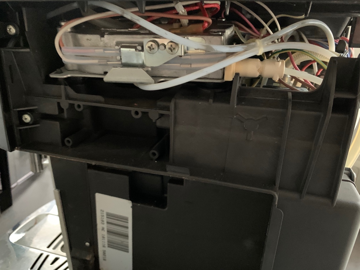 Oberhalb der Pumpe geht ein dicker Gummischlauch (war trocken) und ein dünner Kunststoffschlauch (war Wasser drin) ab. Letzterer führt über eine Kupplung in den Thermoblock.