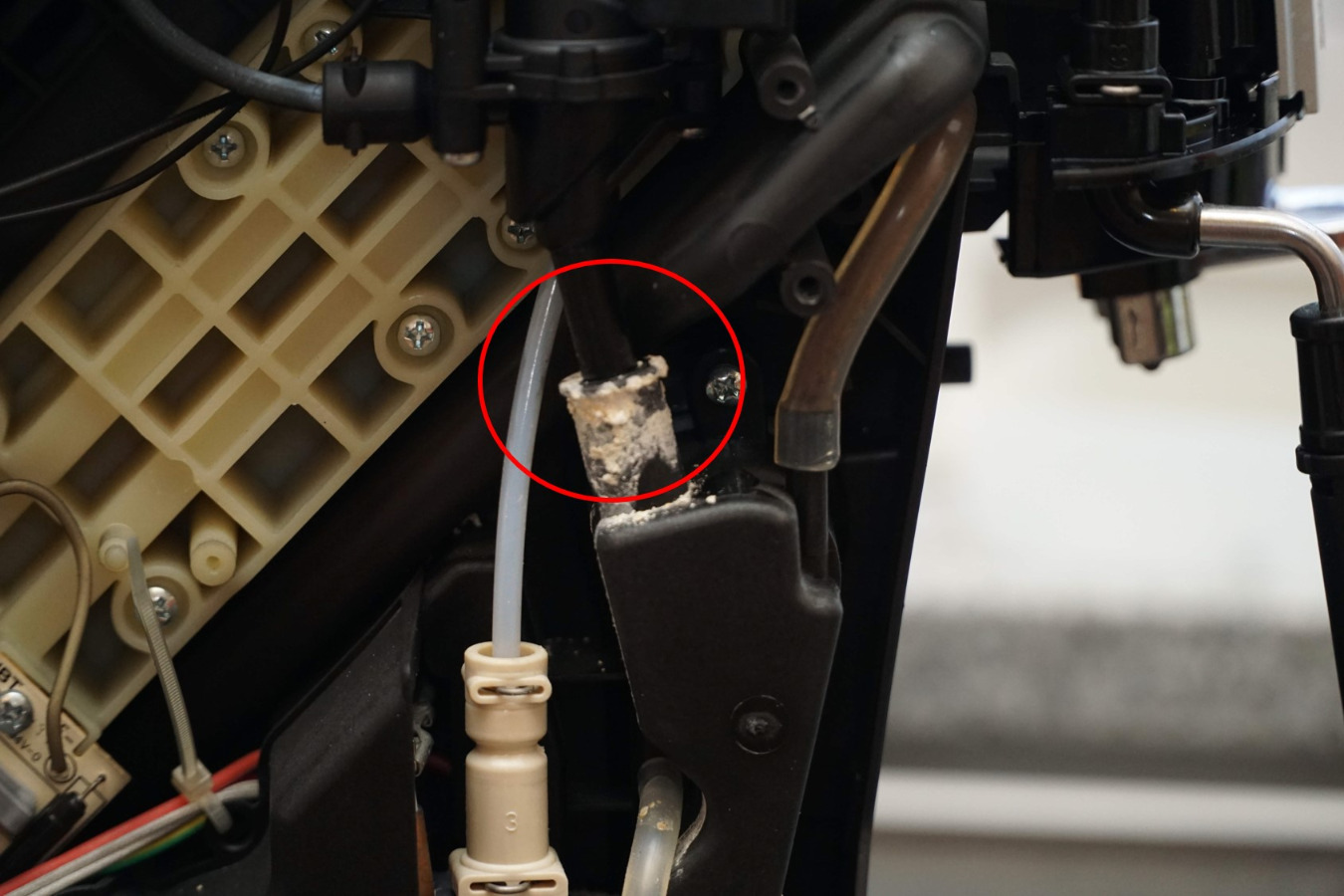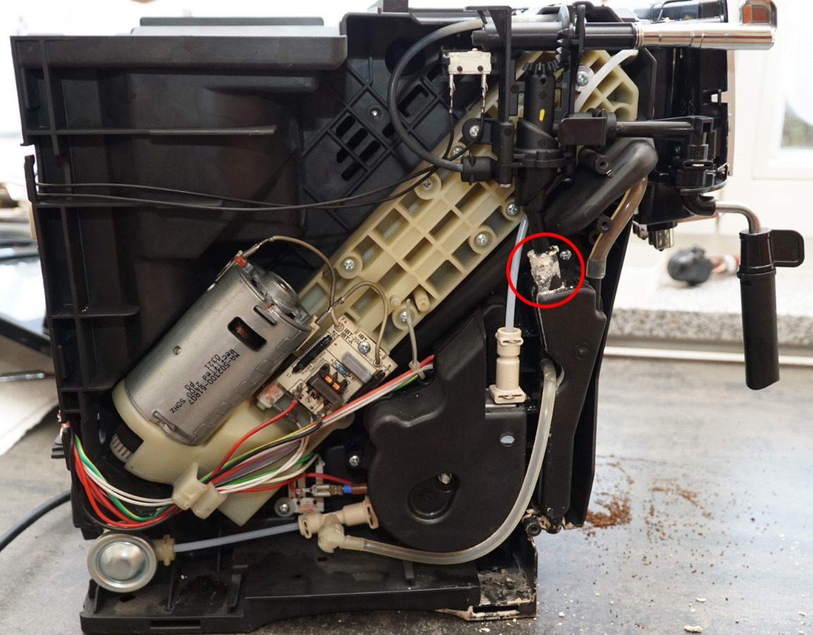 nachdem meine DeLonghi ECAM 22.110B (ca. 6 Jahre alt) sehr wechselhafte Kaffeequalität lieferte (Säuberung und Dichtungswechsel des Brühkolbens hat das wohl gelöst), habe ich auch die Maschine geöffnet und dabei eine undichte Stelle gefunden (siehe Bilder, an der Stelle ist eine starke Verkaltung zu sehen). Es ist wohl die Verbindung zum Auslauf, durch die das Spülwasser beim An- und Abschalten fliesst. aber da bin ich mir nicht sicher. Das auslaufende Wasser findet sich dann unter der Maschine wieder.