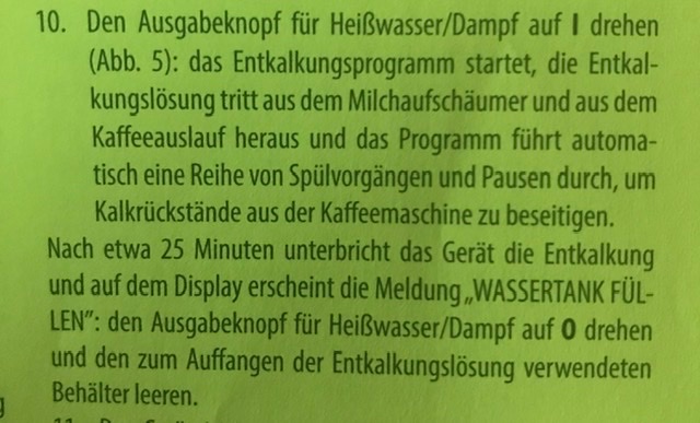 Jetzt entkalken bzw. spülen wir gerade schon den Kaffeeauslauf, “Entkalken” wird noch immer verlangt (davon steht auch gar nichts in der richtigen Anleitung).