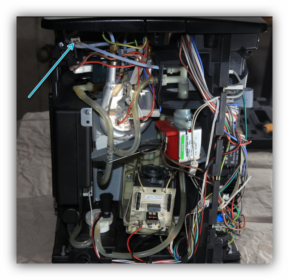 Als wir nun den Entkalkungsvorgang erneut auf Aufforderung der Maschine gestartet haben, konnten wir sehen, dass das Wasser an einer für uns nicht gerade logischen Stelle (von hinten auf die Maschine geschaut: Oben links hinter den ganzen Kabeln, ungefähr auf Höhe der Warmhalteplatte) nicht nur raussifft sondern wirklich rausläuft.
