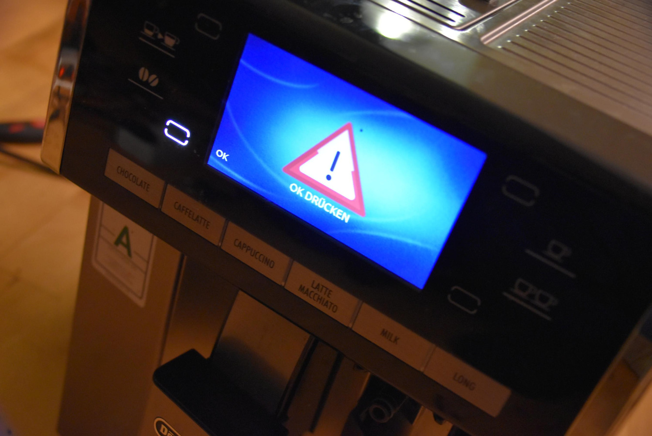 Hallo Zusammen, nach dem Reinigen und Einsetzen der Brühgruppe bei meiner ESAM 6900 hat sich diese irgendwie in der Machine verklemmt. Ich habe daraufhin den Motor nach Öffnen der Bodenplatte manuell zurückgedreht um die Brühgruppe zu entnehmen. Nun taucht ein Warnhinweis auf (siehe Photo), der sich auch durch Drücken der OK Taste oder Ausschalten des Gerätes nicht beseitigen lässt. Auf das Öffnen der Serviceklappe erzeugt keine Reaktion des Gerätes. Die Maschine reagiert auf keinerlei Tastenbefehle. Gibt es die Möglichkeit einen Hardreset neben den üblichen Varianten (Tasten gedrück halten, Serviceklappe öffnen etc.) durchzuführen? Was kann das Problem sein?