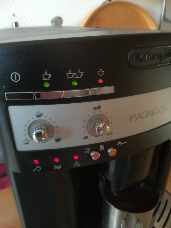 Betätige ich nun den EIN/AUS Schalter des Automaten Leuchten drei LEDs (1Tasse, 2Tassen und die "Warn Anzeige", das Dreieck mit dem ! )