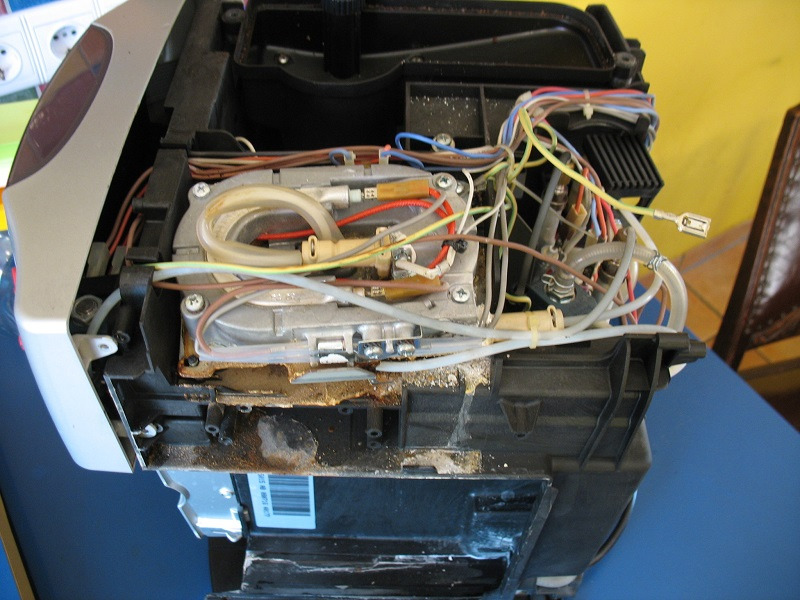 Heizung/Thermoblock sind äusserlich ziemlich verkalkt und bei genauem hinschauen tropft Wasser aus dem unteren Schlauch.