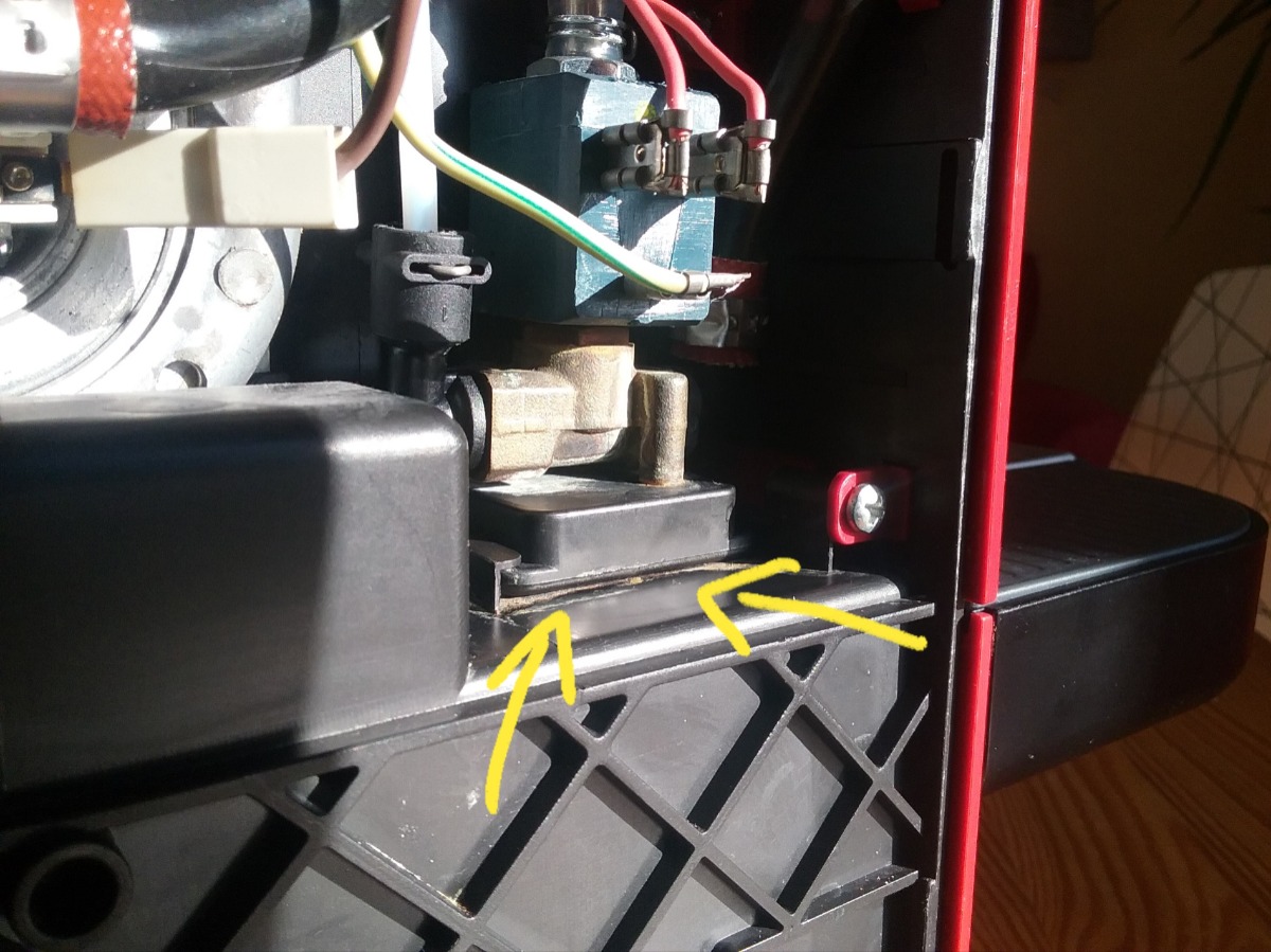 • Da habe ich mich versehen und das falsche Foto eingestellt! Das Foto zeigt zwar den Bereich, wo ich den Fehler vermute, allerdings tritt das Wasser unten aus (s. Pfeile)!
