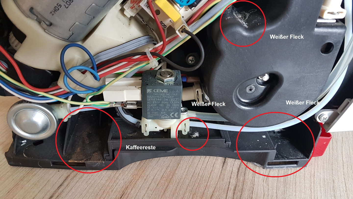 so, dass Messgerät und das Werkzeug-Set sind bei mir eingetroffen. Habe die Maschine hinten und an den Seiten so weit bereits freigelegt. Mich irritiert etwas, dass auf der rechten Maschinenseite Kalk und teilweise Kaffeereste zu sehen sind. Die Maschine hat schon seit längerer Zeit mal ne Wasserpfütze unter sich gehabt.