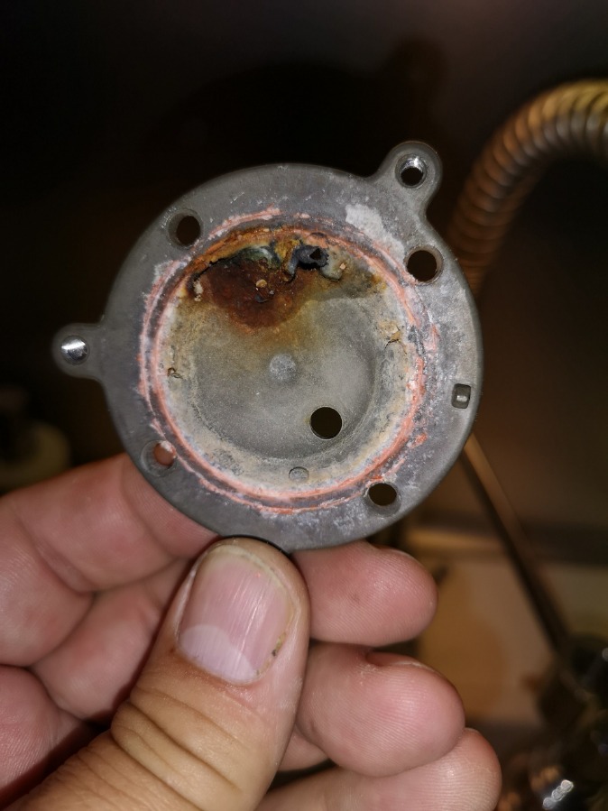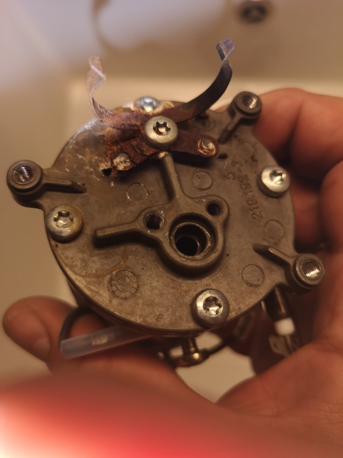 Ihr habt mir schon einmal sehr bei der Reparatur meiner E75 geholfen, nun hat sie ein anderes Problem: Von jetzt auf nachher kommt statt Kaffee Wasser vorne seitlich aus dem Gehäuse, sowohl bei versuchtem Kaffee- als auch bei Warmwasserbezug. Aufgeschraubt: Das Wasser tritt kräftig aus einem kleinen Loch auf der Oberseite der Heizpatrone aus. Das Loch sieht aus, als ob es da hingehöre (Entlüfter? Überdruckaustritt?).