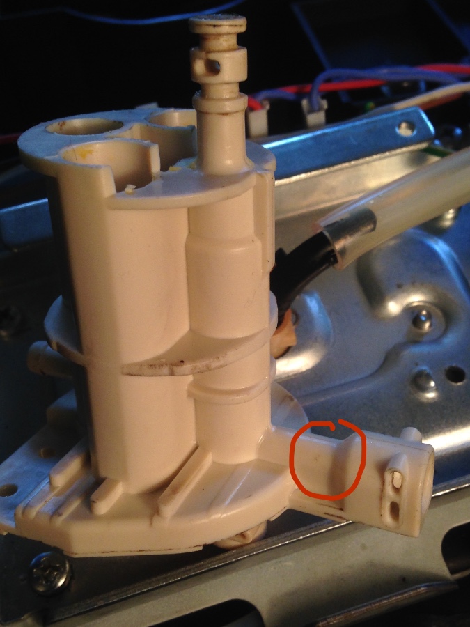 Ganz offensichtlich spritzte beim Spülvorgang ein kräftiger Strahl aus dem Raccord, der zum Dampf- und Wasseraustritt führt. Mindestens 3 Mal habe ich den oberen Brühkolben ein- und ausgebaut und unterschiedliche Dichtungsstärken und Kombinationen ausprobiert,- aber die Leckage blieb. Letztendlich organisierte ich mir noch mehr Licht und erkannte, dass der feine Wasserstrahl weiter hinten entstand und nur am Schlauchausgang abprallte. Im weißen Grundkörper der oberen Brühkolbens hatten sich mikroskopisch kleine Löcher gebildet, die mit bloßem Auge und D