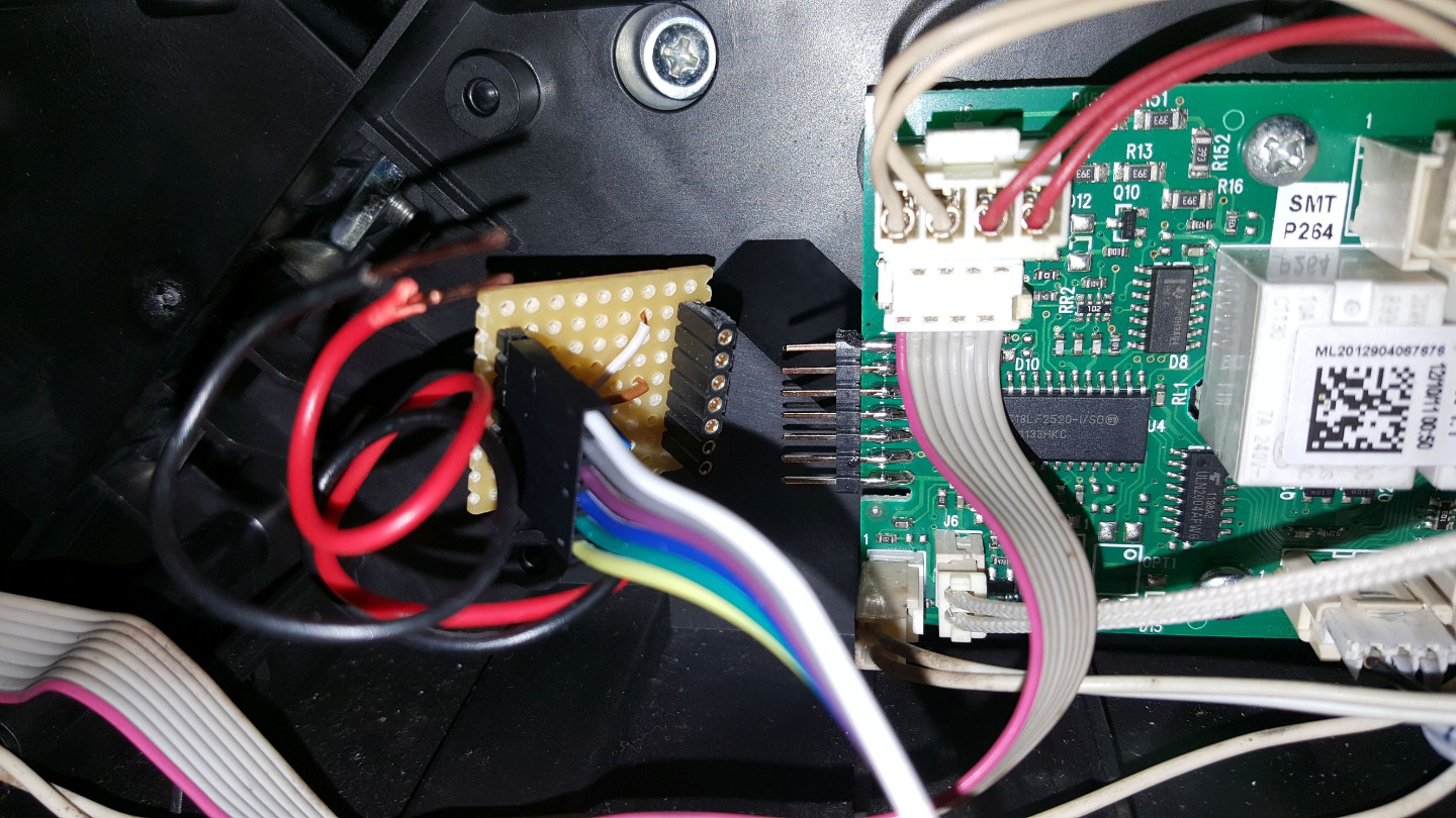 Da die Platine in der ECAM 22.10 keinen direkten Anschluß für den Programmer hat, habe ich dann einen 7pol. Pfostenstecker auf die Platine gelötet und sie so über eine kleine Adapterplatine mit dem Programmer und dem PC verbunden.