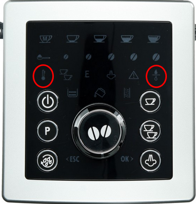 Ich habe einen DeLonghi ECAM 23.210. Bis vorgestern habe ich ganz normal meinen Kaffee zubereitet. Gestern morgen habe ich es eingeschaltet und es ging nicht weiter. Wenn ich es einschalte blinken die Temperatur lampe und (dritee reihe, erste lampe, und die Lampe mit den zwei Wassertropfen, ebenfalls 3 Reihe, letzte lampe). Siehe Bild im Anhang.