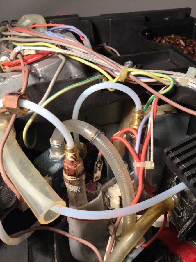 Danach die Maschine aufgeschraubt und Leitungen kontrolliert. Alle Leitungen frei, Das hintere Ventil blockiert und im Testmodus bei betätigen der "1 kleine Tasse" gibt er frei (so wie er soll).