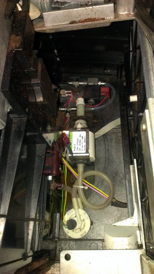 Ich vermute mal, das befindet sich unterhalb des Wassertanks. Die eine Schraube unter der kleinen Kappe habe ich gefunden.