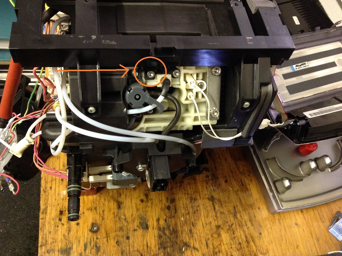 Das Wasser kommt jedoch vom Brühkolben, ich habe den weißen Verbindungsschlauch vom 3-Wegeventil zum Brühkolben mal abgezogen, das Wasser kam reichlich aus dem Anschluss am Brühkolben (Siehe im Anhang "Brüheinheit oben")