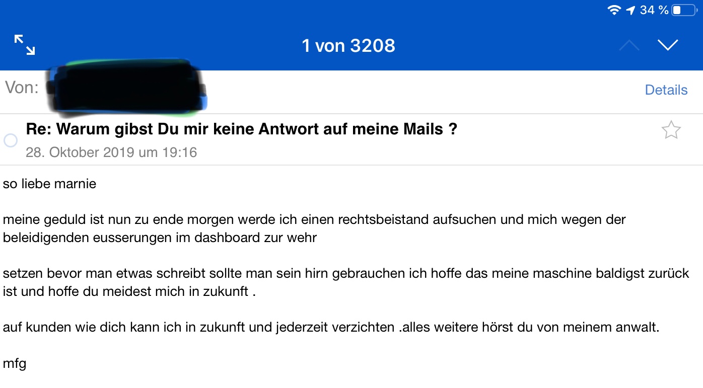 Leide4 habe ich bisher keinerlei Rückantwort auf meine Mails an ihn bekommen, da er aber auch als selbstständiger Reparateur und Gebrauchtmaschinenhändler arbeitet, gehe ich davon aus, dass ich irgendwie an mein Geld komme und die Maschine zurück senden kann.