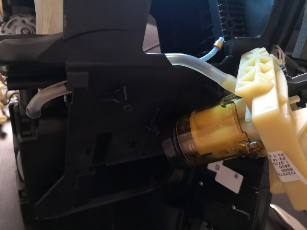 • Der Schlauch führt Wasser vom oberen Brühlkolben nach dem kaffeebrühen zur Expansionskammer ab. Das ist dieses schwarze Kunststoffformteil, in das der Schlauch führt. Dieses Teil, das auch den Durchlauferhitzers in Position hält, solltest du auch aufmachen. Dazu musst du vier oder fünf Schrauben lösen und das ganze Teil incl Erhitzer etwas abziehen. Kabel brauchen keine abgemacht werden, sie so gehen. Aufpassen, eine der Schrauben ist länger, nicht verwechseln beim Zusammenbau. Da ist sicherlich auch viel Schmutz drin. Da kann auch schonmal Schimmel dabei sein. Die schwarzen Stückchen im Schlauch sind vermutlich Kaffeereste, passiert schonmal wenn der obere Brühlkolben nicht mehr ganz fit ist.